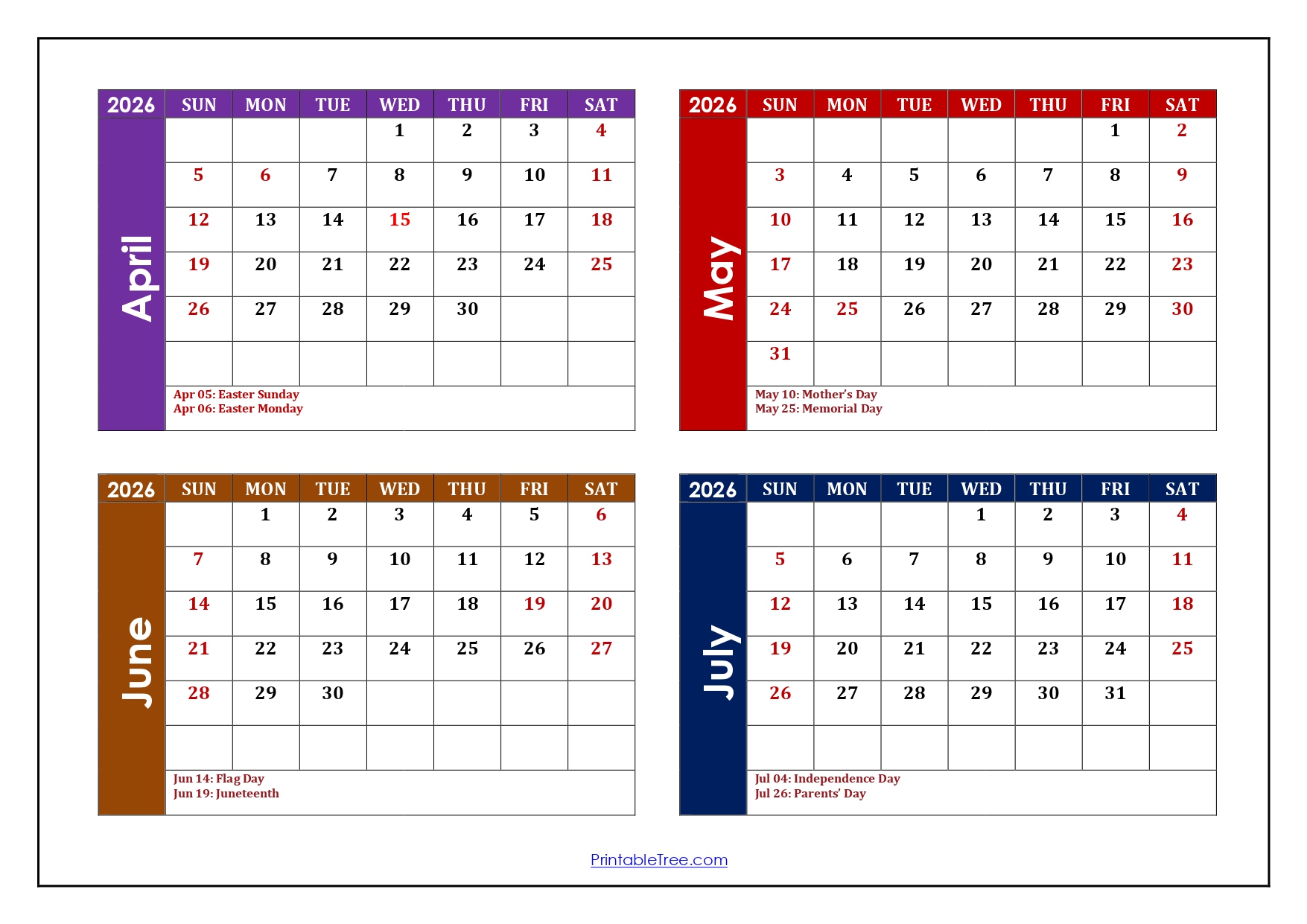 Are you searching for an April to July 2026 Calendar PDF template? If yes, you have come to the right place. We have many designs for the Four-month calendar (April, May, June, and July) on a single Page. You can download and print it for free. We also have the April to July 2026 Calendar available in PDF and JPG formats.