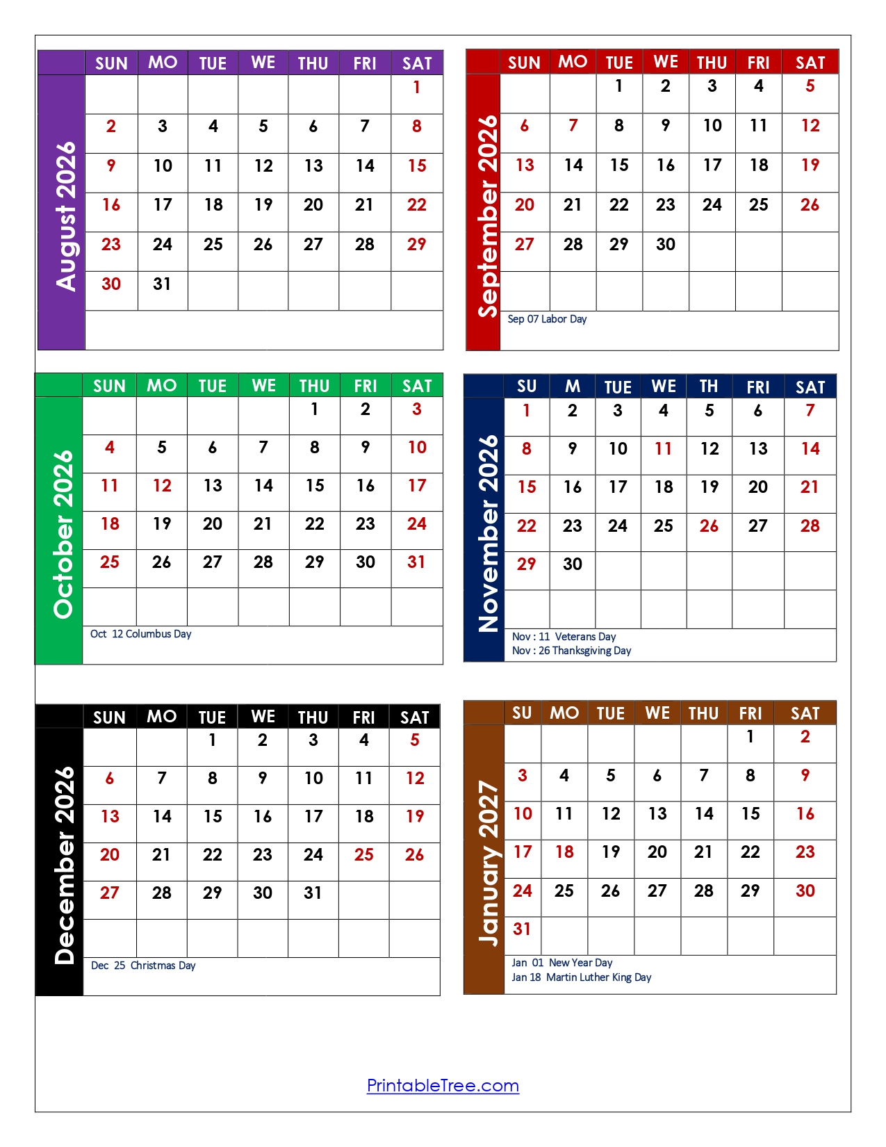 Are you looking for an August 2026 to January 2027 Calendar PDF template? If yes, you have come to the right place. We have many designs for the Six-month calendar on a single Page. You can download and print it for free. We also have the calendar for August 2026 to January 2027 Calendar available in PDF and JPG formats.