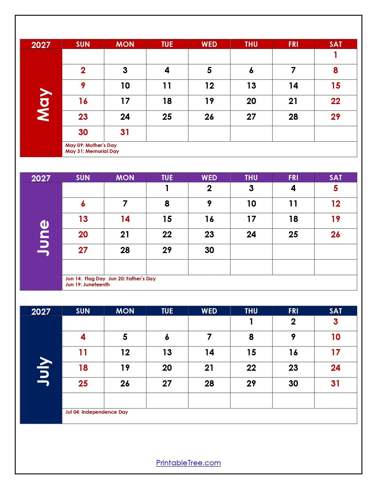 Free Printable Calendar for May to July 2027 Calendar PDF Templates. A three-month calendar can be easy to use for personal or professional use. A May to July 2027 Calendar on a single page is available for free download and printing in PDF and JPG formats.