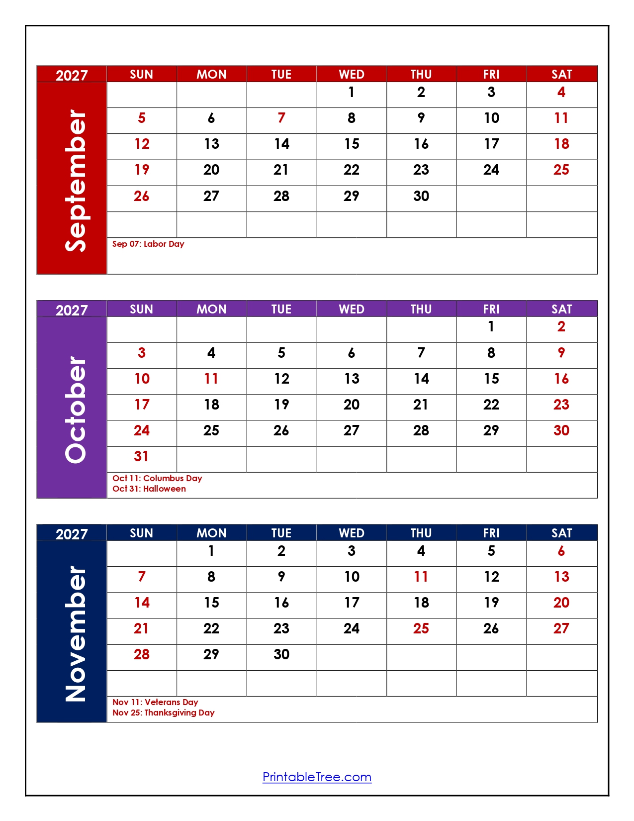 Free Printable Calendar for September to November 2027 Calendar PDF Templates. A three-month calendar can be easy to use for personal or professional use. A September to November 2027 Calendar on a single page is available for free download and printing in PDF and JPG formats.
